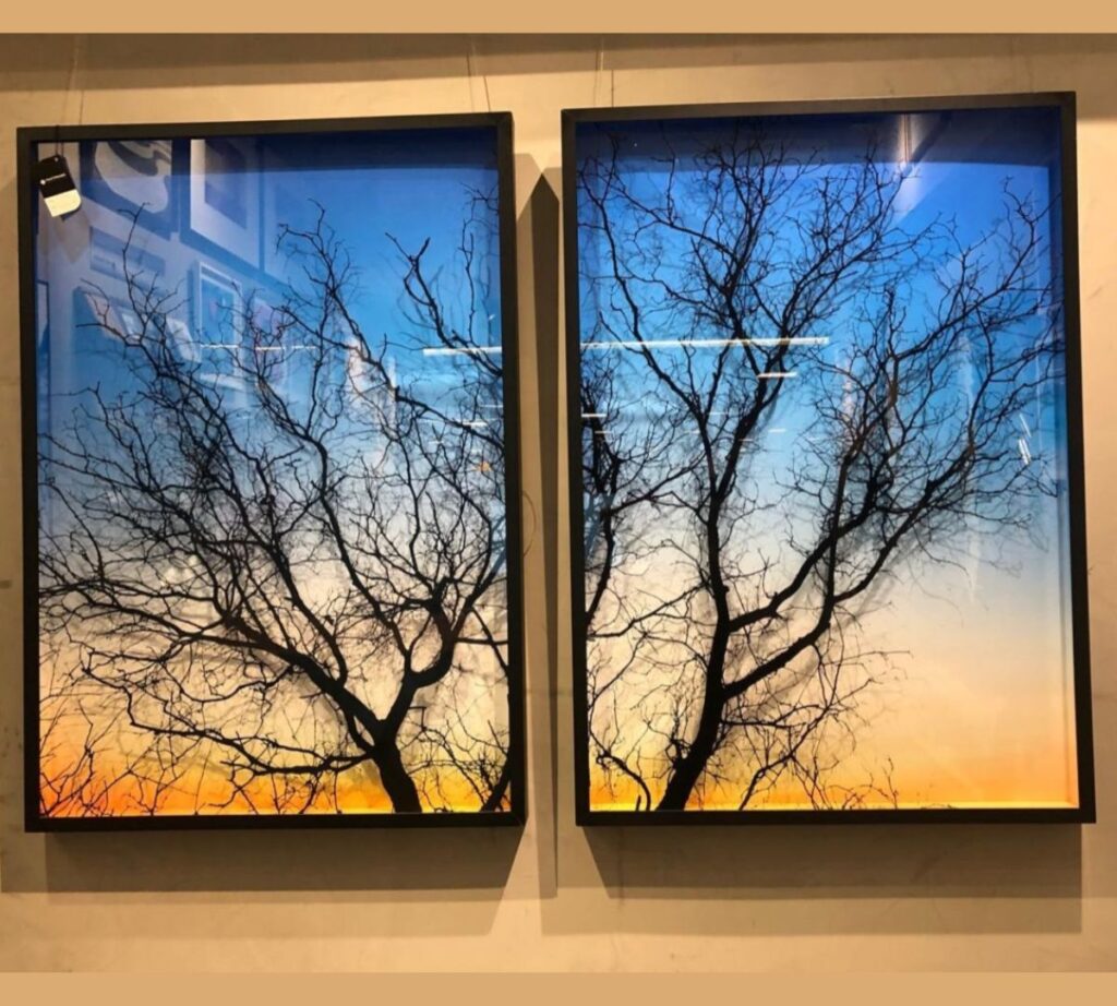 Este quadro decorativo exibe uma impressão em vidro de galhos intricados sobre um fundo azul profundo. Com uma moldura preta que complementa a intensidade das cores, esta peça é perfeita para adicionar um toque de tranquilidade e elegância a qualquer espaço. A transparência do vidro confere um efeito visual único e contemporâneo.